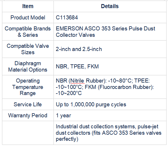 C113684 diaphragm kit is specifically designed for the EMERSON ASCO 353 series pulse jet dust collector valves. It is a great option if you're looking for something that offers great value for money. Using our SMCC diaphragm kit keeps the pulse valve working as well as it should, stops baghouse dust collectors from being out of action, and greatly reduces the cost of replacing diaphragms.