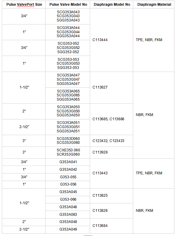 A1: The C113684 kit fits 2-inch and 2.5-inch pulse valves. Verify valve size before purchase to ensure perfect fit. For other specifications or series, refer to the order code chart below for reference.