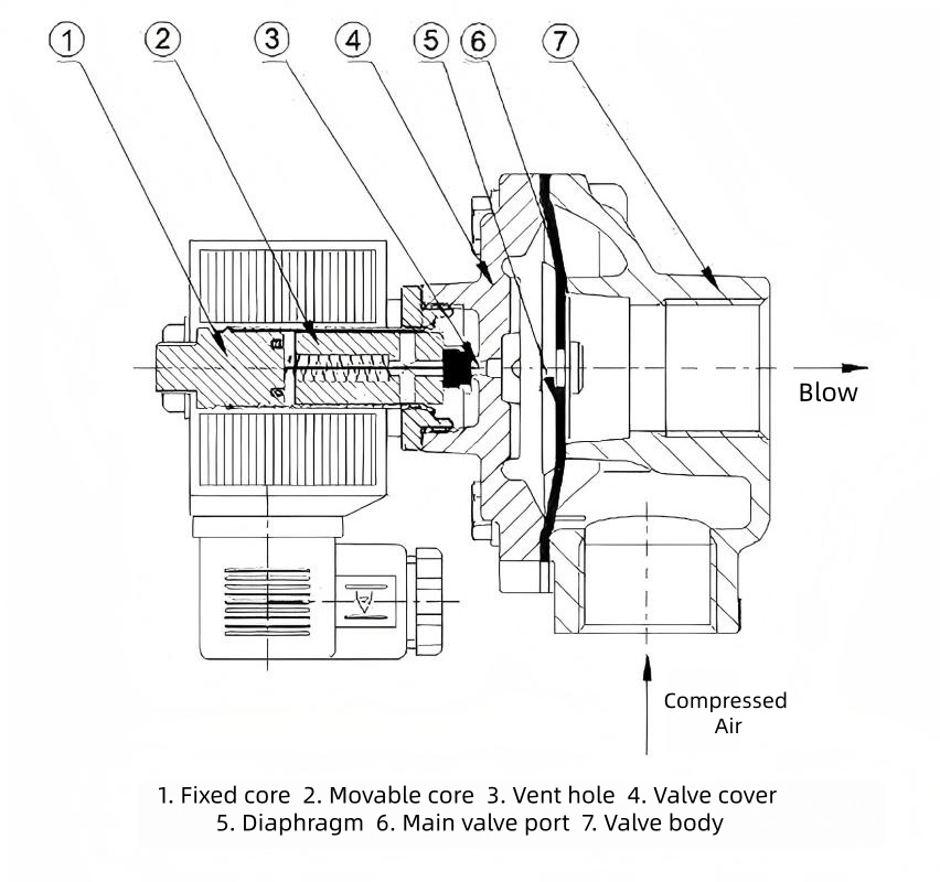 Diaphragm Actuation: Operated by pneumatic pressure differential. When energized, the solenoid head opens the relief port to vent rear chamber pressure, allowing front chamber gas to lift the diaphragm for blowback. Upon de-energization, the spring resets to close the orifice, restoring the sealed state.