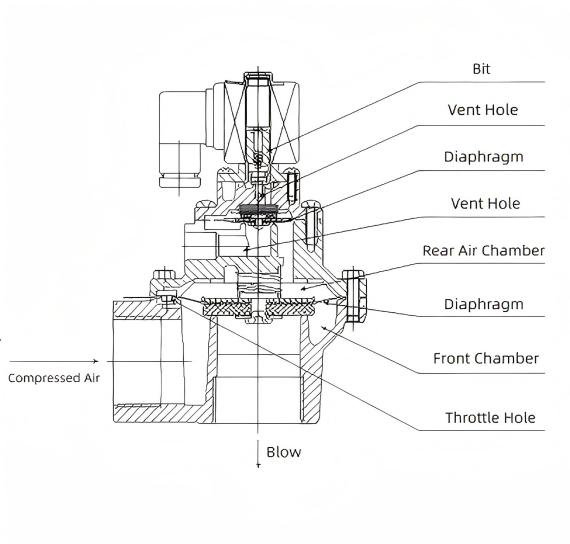 The diaphragm divides the electromagnetic pulse valve into front and rear chambers. When compressed air is supplied through the throttle hole into the rear chamber, the rear chamber pressure forces the diaphragm to seal the valve outlet, placing the electromagnetic pulse valve in the “closed” state. When the electrical signal from the pulse jet controller ceases, the solenoid valve armature resets. The rear chamber vent closes, and the increased pressure in the rear chamber forces the diaphragm to seal the valve outlet, returning the solenoid valve to the “closed” state. The electromagnetic pulse valve controls the opening and closing of the valve body's relief port via electrical signals. During valve relief, pressurized gas in the rear chamber is vented, while pressurized gas in the front chamber is throttled by the diaphragm's vacuum port, lifting the diaphragm to initiate pulse blowing. When the valve body ceases unloading, pressurized gas rapidly fills the rear chamber through the damping orifice. Due to the difference in force-bearing areas on both sides of the diaphragm against the valve body, the gas force in the rear chamber becomes dominant. This reliably closes the diaphragm over the valve's discharge port, halting the pulse valve's discharge.